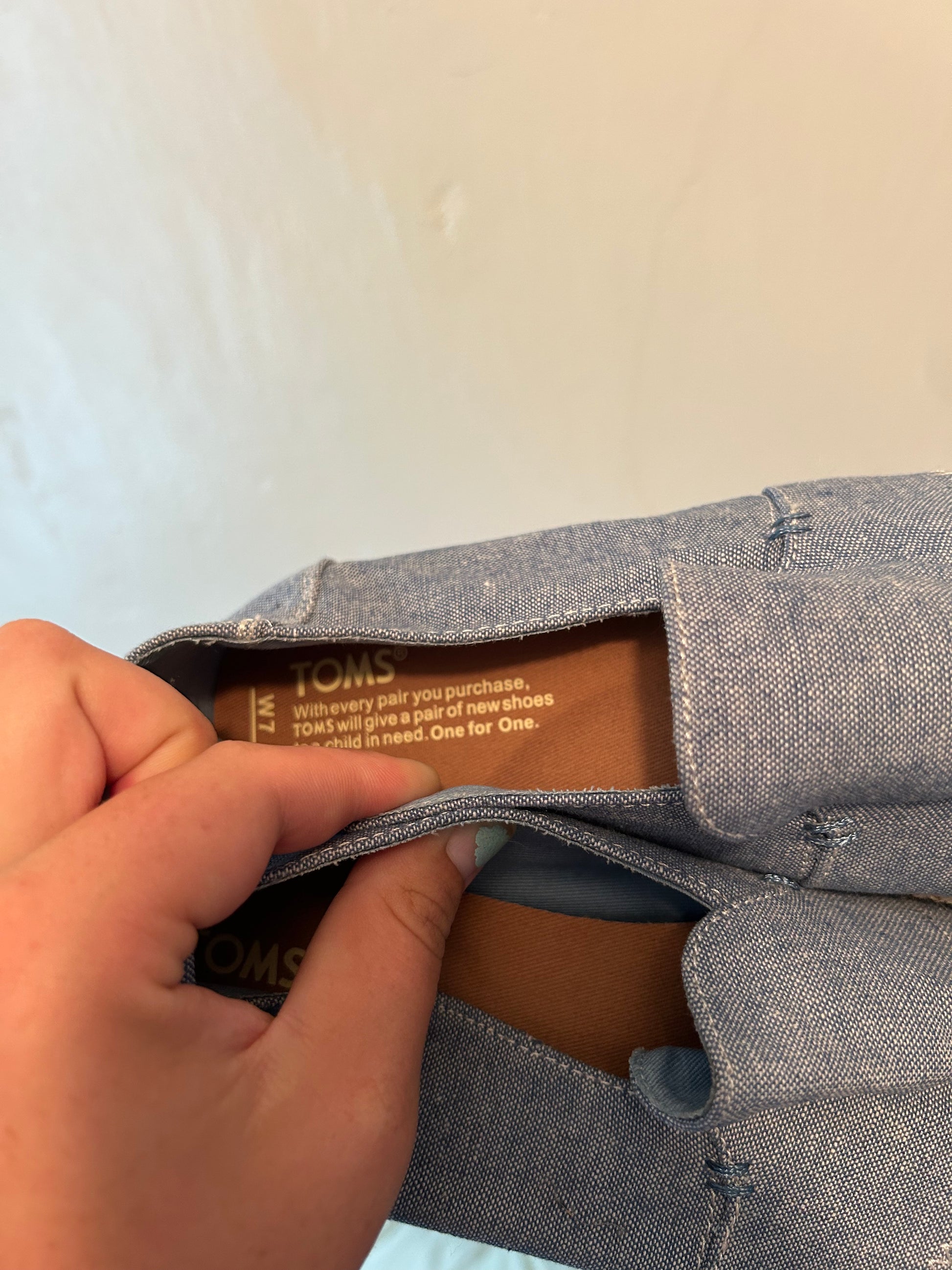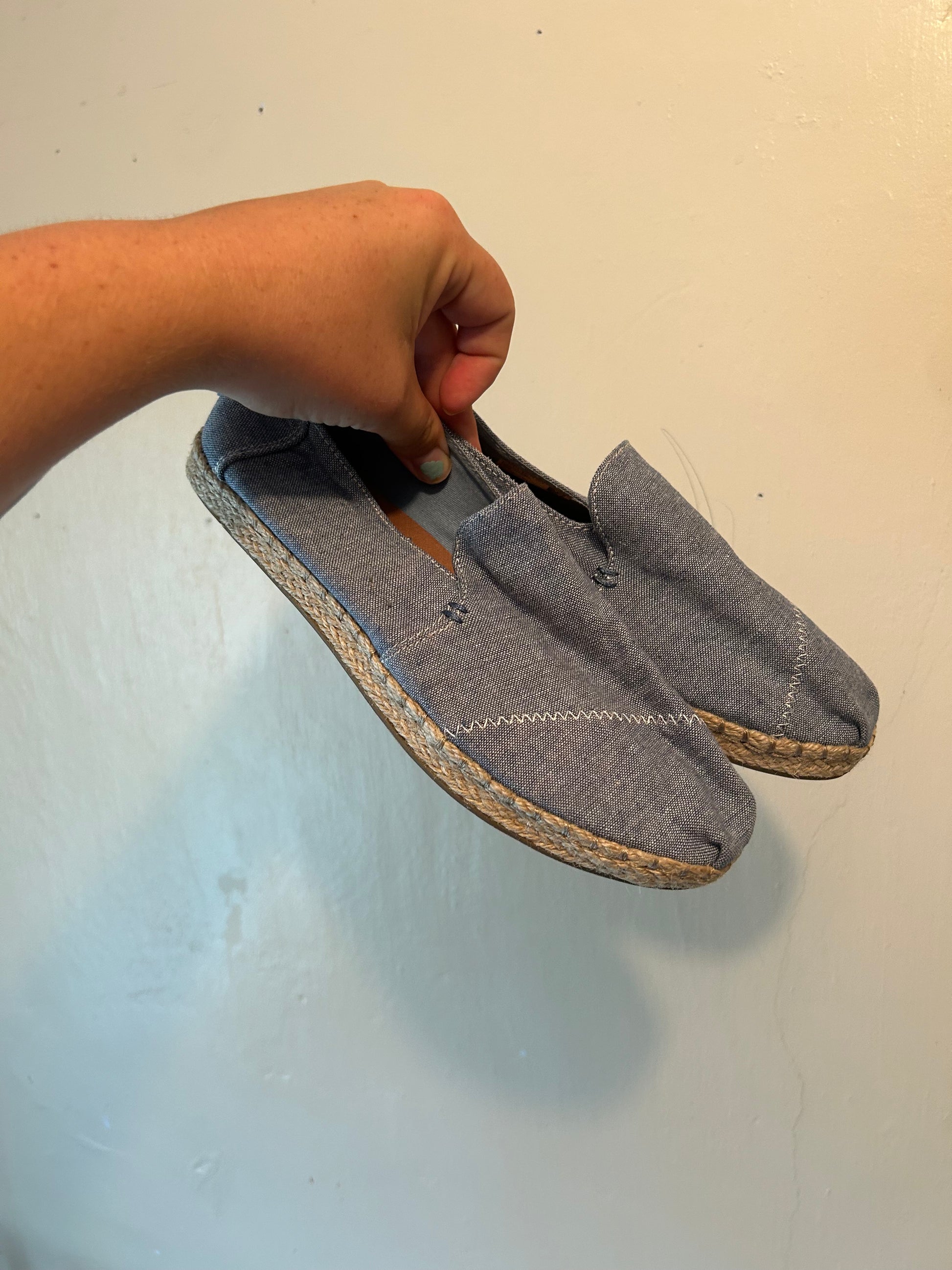 TOMS Brand. Slip on flat shoes. Denim looking blue with woven sole trim. Size women’s 7. Brand new condition